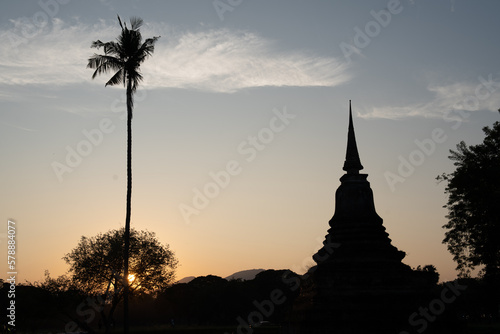 Historic Town of Sukhothai temple park, Ancient Buddha Statue at sunset Sukhothai historical park, Mahathat Temple