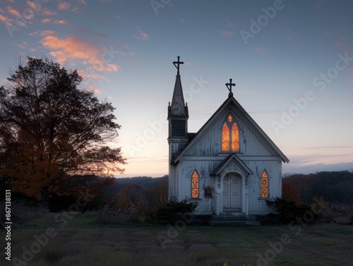 Historic White Wooden Church with Stained Glass Windows at Sunset in Autumn Countryside