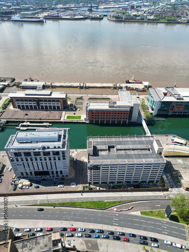 Historical and Modern Central Town Center and Downtown Buildings at British City Centre of Liverpool, Maritime city in northwest England, United Kingdom on Beach and Ocean Docks. May 5th, 2024.