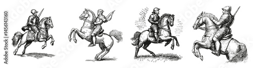 Historical Illustrations of Horse Riders in Various Poses and Actions, Logo Design, Hand drawing Engraving, Vector Illustration Isolated Object