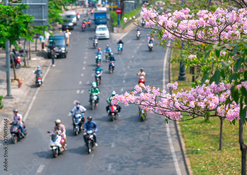 Ho Chi Minh city, Vietnam, March 16th, 2019: Traffic in Saigon from high view, street with motorbikes, car move under pink tabebuia rosea flower tree of developed city in Ho Chi Minh City, Vietnam