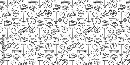 Hobby Doodle Pattern. Sport Bicycle, scooter, skateboard and roller Skates. Personal two-wheeled transport. Outline hand drawn symbols. Helmet. Seamless passion print. Contour. Vector illustration