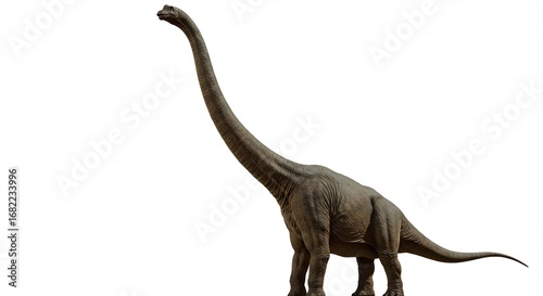 Hoch aufragender Dinosaurier steht majestaetisch vor weissem Hintergrund. AI Generated
