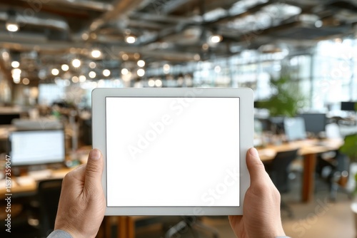 Holding a blank screen tablet device in a modern coworking office with a blurred background, suggesting digital innovation and communication in the workplace.