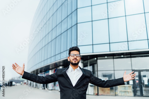 Holding company, opposite a handsome bearded Indian man, he holds out his hands, a successful Indian businessman