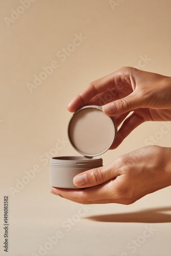 Holding Cosmetics: A person delicately holds a cosmetic container, showcasing the product with a subtle and elegant touch, capturing the essence of self-care and beauty.