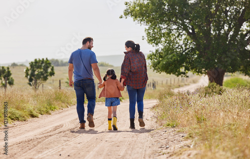 Holding hands, parents and walking with kid on farm for love, care and support with family on dirt road. Back, mother and father with girl in countryside to travel together, holiday and agriculture