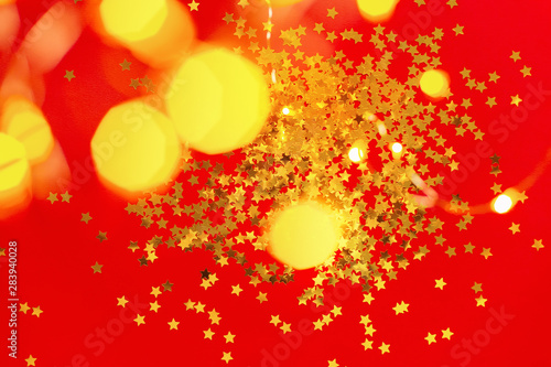 Holiday background with little golden stars and garland lights on red background. Flat lay, top view