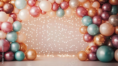Holiday background with metallic balloons, christmas or other events, confetti and ribbons. Birthday party, anniversary, new year.