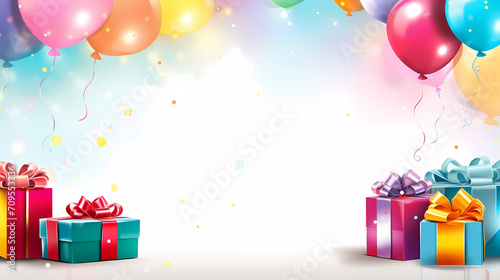 Holiday celebration background with balloons, golden sparkling confetti and ribbons