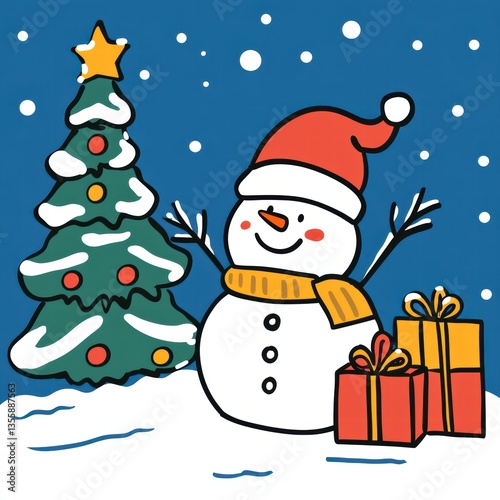 Holiday Cheer: A snowman with a festive hat and scarf stands joyfully beside a decorated Christmas tree and gift-wrapped presents, captured in a cute and happy illustration.