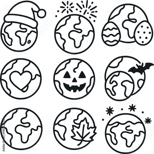 Holiday earth icons set – outline, festive and global celebration symbols