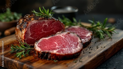 Holiday feast highlight: succulent roast beef slices. AI-crafted culinary art.