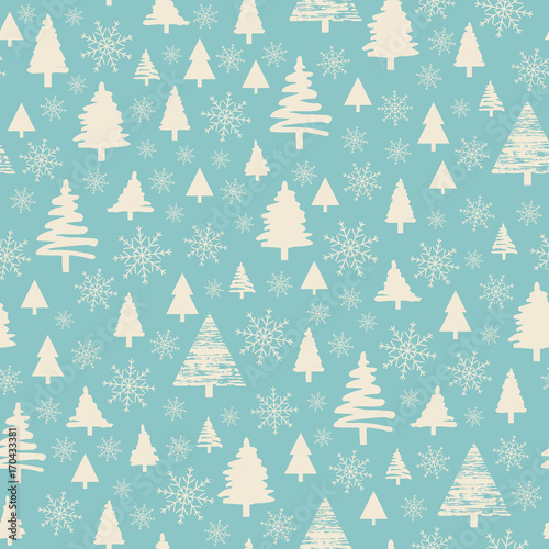 Holiday pattern Christmas decoration. Forest on a blue background. Snow in the woods. White trees and spruce. Vector illustration.