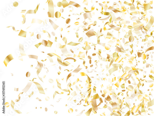 Holiday realistic gold confetti flying on black background.