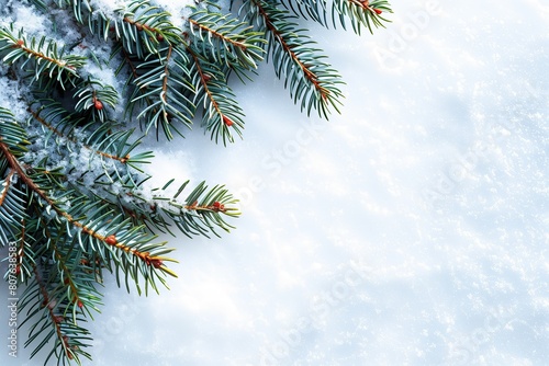 Holiday season concept. New Year 2025. Frosty blue spruce tree branches on white snow background with copy space. Christmas card design. Fir branch. New Year card template
