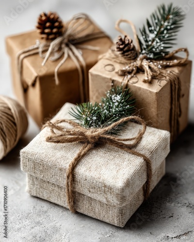 Holiday shopping flat lay: unbranded gift boxes, silk ribbons, pine sprigs, kraft paper, premium scissors and twine, clean off-white backdrop with generous