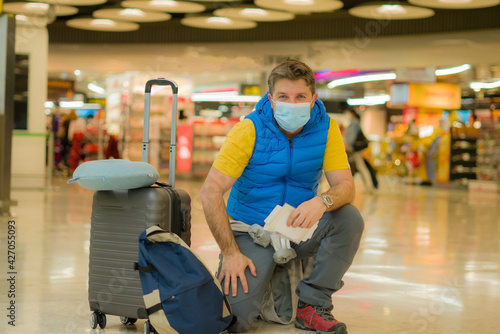 holiday travel and tourism during covid19 - young happy and attractive man in face mask at airport departures lounge holding passport and boarding pass