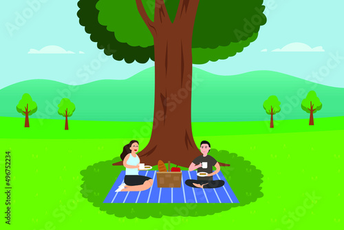 Holiday vector concept. Young couple eating together while having picnic at the park