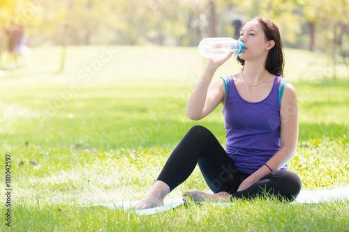 Holiday woman relaxation doing yoga pose meditation in the public park Sport Healthy concept.