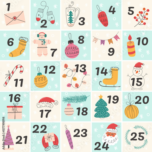 Holiday-themed advent calendar with cozy winter illustrations and numbers