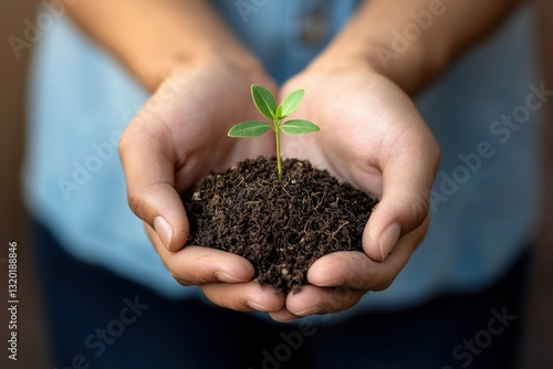 Holistic Wellbeing Positivity Concepts. A person holding a small plant in hands with soil.