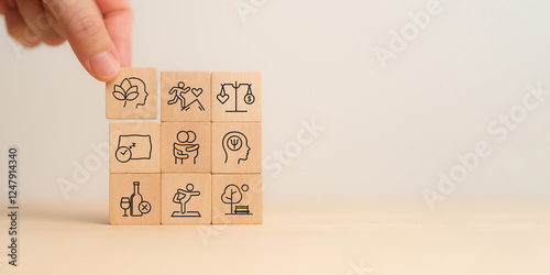 Holistic Wellness Concept. Wooden block with wellness icons, health care ,including mental well-being, fitness, nutrition, sleep, relationships and financial balance. Personal development and balance.
