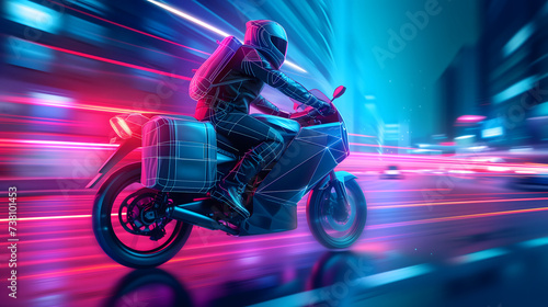 Hologram of futuristic logistic system. A neon-lit, high-tech delivery motorcycle with a biker. Glowing streaks accents speed as a background. Vivid purple and blue color scheme. Back view.