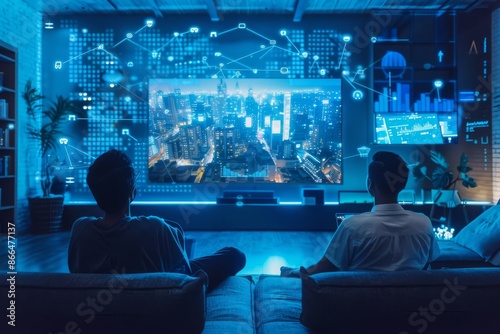Hologram television in futuristic living room. Smart apartment with innovative technology.