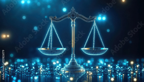 Holographic AI legal consultants showcase futuristic scales of justice at a modern event