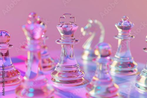 Holographic chess on a pink background.Chess game figurine. Chess pieces. Board games. Strategy games. Business strategy. 3d illustration, 3d rendering