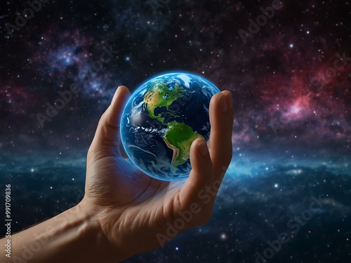Holographic Earth held in a human hand against a cosmic backdrop.