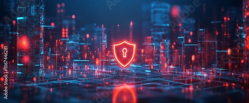 Holographic Icons Representing Digital Security Above Abstract Cityscape. AI generated illustration