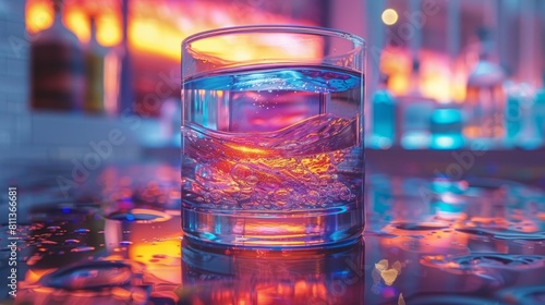 holographic liquid art, a clear container holds holographic liquid creating a magical atmosphere, fusing science and art to captivate the room