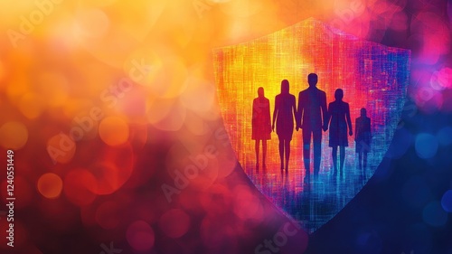 Holographic people shielded by layered icon digital realm graphic design abstract environment eye-level view security concept