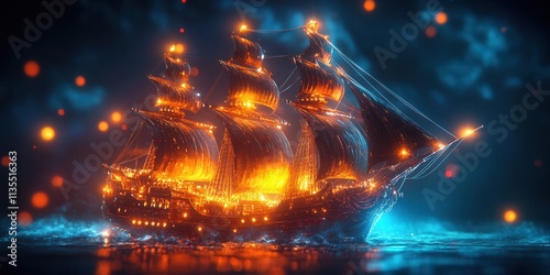 Holographic Pirate Ship with Glowing Sails, Enchanted Cannons, Fantasy Nautical Adventure, Vibrant Digital Artwork