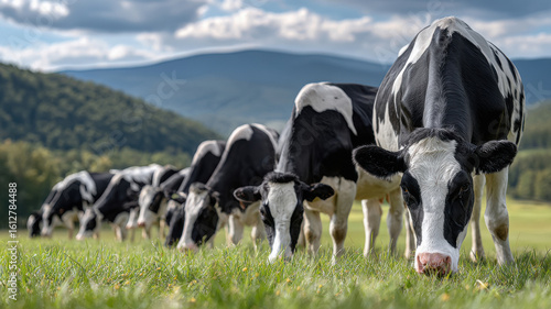 Holsteins dairy cows grazing on a dewy pasture at lush green