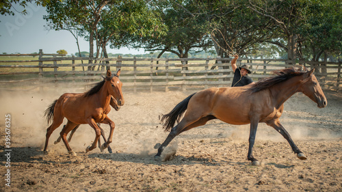 hombre intenta amarrar un caballo con su lazo.