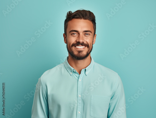 Hombre latino, joven, atractivo y con barba corta, feliz, usando ropa casual de color azul posando sobre un fondo del mismo color