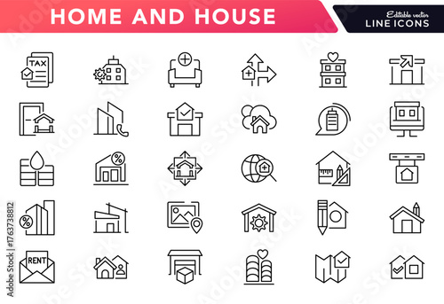 Home and House line icon set. Hotel, city, town house, mall, real estate, construction, renovation vector outline icons. Pixel-perfect icon pack
