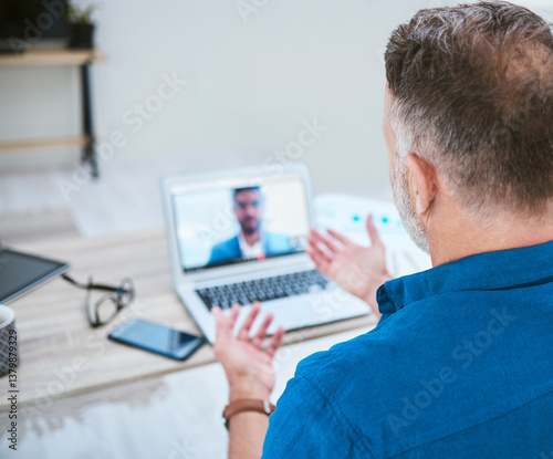 Home, business man and video call on laptop for meeting, corporate deal and negotiation with client. Screen, remote work and mature person by back for networking, communication and planning in house