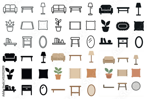 Home decor icons set – silhouette, solid, furniture and interior design graphics