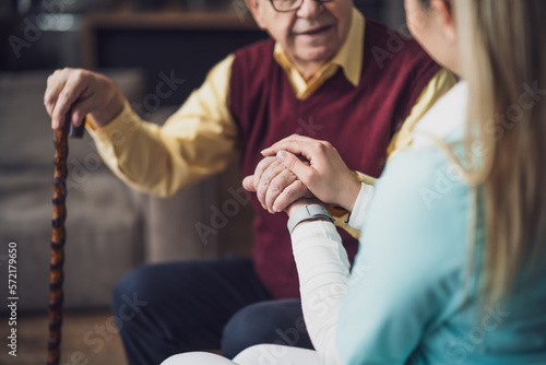Home doctor is visiting senior man to check his health. Professional caregiver is assisting old man at his home.