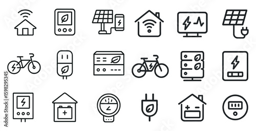 Home energy solid icons set – line, outline, electricity, and renewable energy symbols