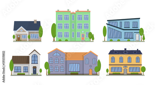 Home facade with doors and windows. Suburban American house exterior flat design front view with roof and some trees. Apartment in a townhouse. Modern buildings in a flat style. Vector illustration.