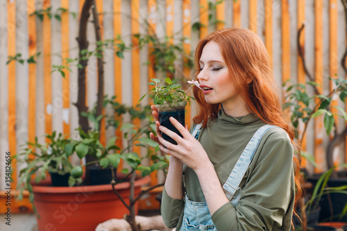 Home gardening. Young pretty woman holding hands flower pot and smelling spring flower.
