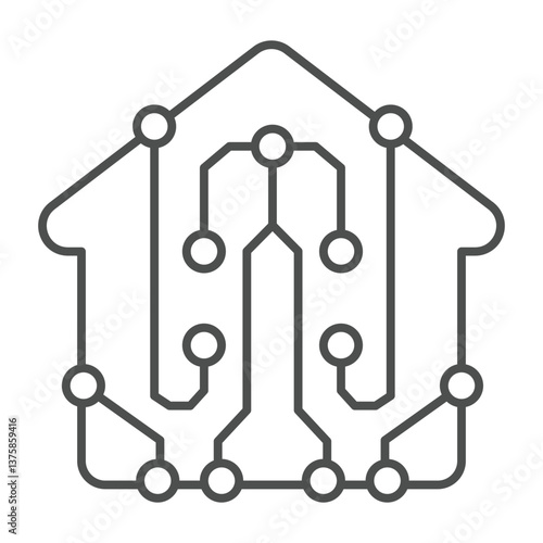 Home house with connections thin line icon, neural network concept. Vector graphics. Building with circuit grid, program sign on white background, outline style icon for mobile or web design.