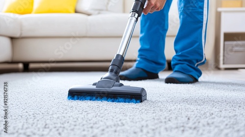 Home hygiene vacuuming process a person using a vacuum cleaner on a clean carpet in a modern living room. This scene captures the essence of home maintenance and hygiene.