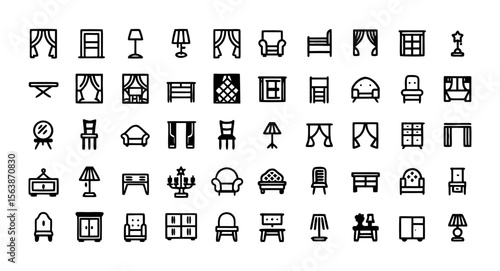 Home Interior Outline Icon Set – Editable Stroke Vector Icons of Furniture, House Decoration, Sofa, Lamp, Bed, Table, Chair, Shelf, Home Accessories, and More – Line Style Interior Design Icons