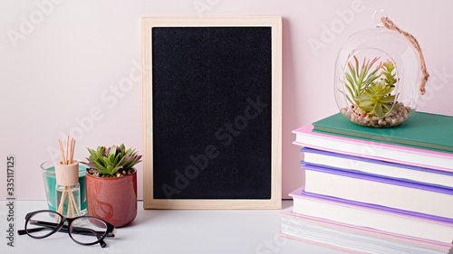 Home interior with books stack, eyeglasses, house plants succulents and fragrant candle and sticks. Still life with black board for text, stack of colorful books and home interior decor
